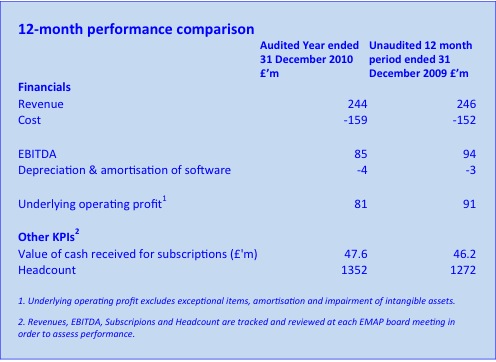 - EMAP Inform – generated revenues of £53m (year ended 31 December 2009: £60m)