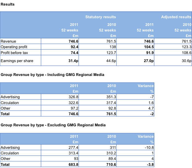 Trinity Mirror PLC has announced preliminary results for 2011.