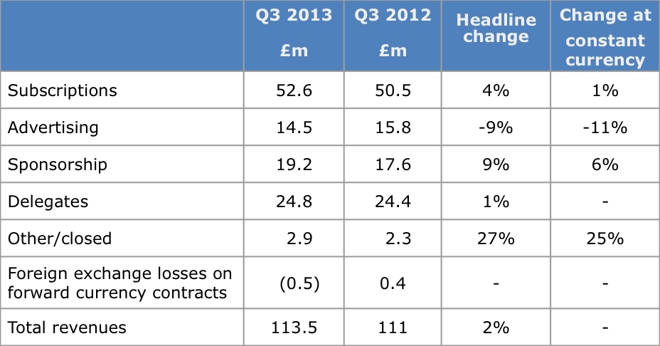 Subscription revenues increased by 4%, and by 1% at constant currency. The rate of growth at constant currency was less than the 3% achieved in the second quarter due to delays in the receipt of a few subscription accounts which are recognised on a cash basis. This timing difference is expected to reverse in the final quarter. The 11% decline in advertising revenues was consistent with the trend seen over the previous 18 months with advertising from global financial institutions particularly weak.