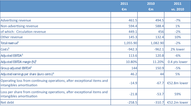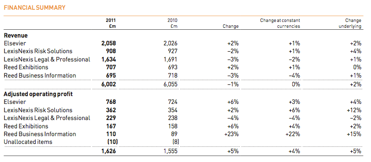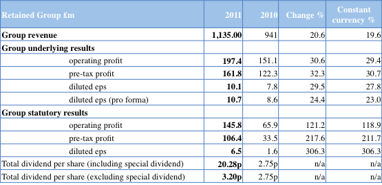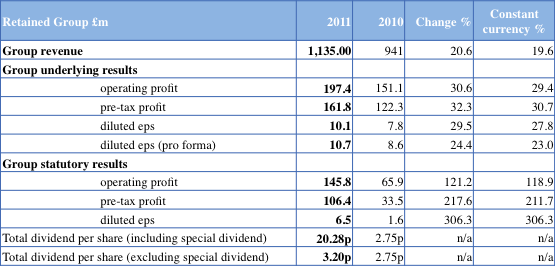 Group revenues for the six months to March 31, 2012 are expected to show an increase of 13% to £189 million. Underlying revenues, excluding the impact of last year’s acquisition of Ned Davis Research (NDR), increased by approximately 5%. Headline subscription revenues are expected to have increased by 22%, and accounted for 53% (2011: 49%) of the group’s revenues for the period. Underlying subscription revenues, excluding NDR, increased by approximately 7%, continuing the good momentum from 2011. Advertising and sponsorship revenues are down by 8%. The stronger performance of delegate revenues in the second quarter was mostly due to timing differences on events and the impact of the political unrest in the Middle East on delegate bookings last year.